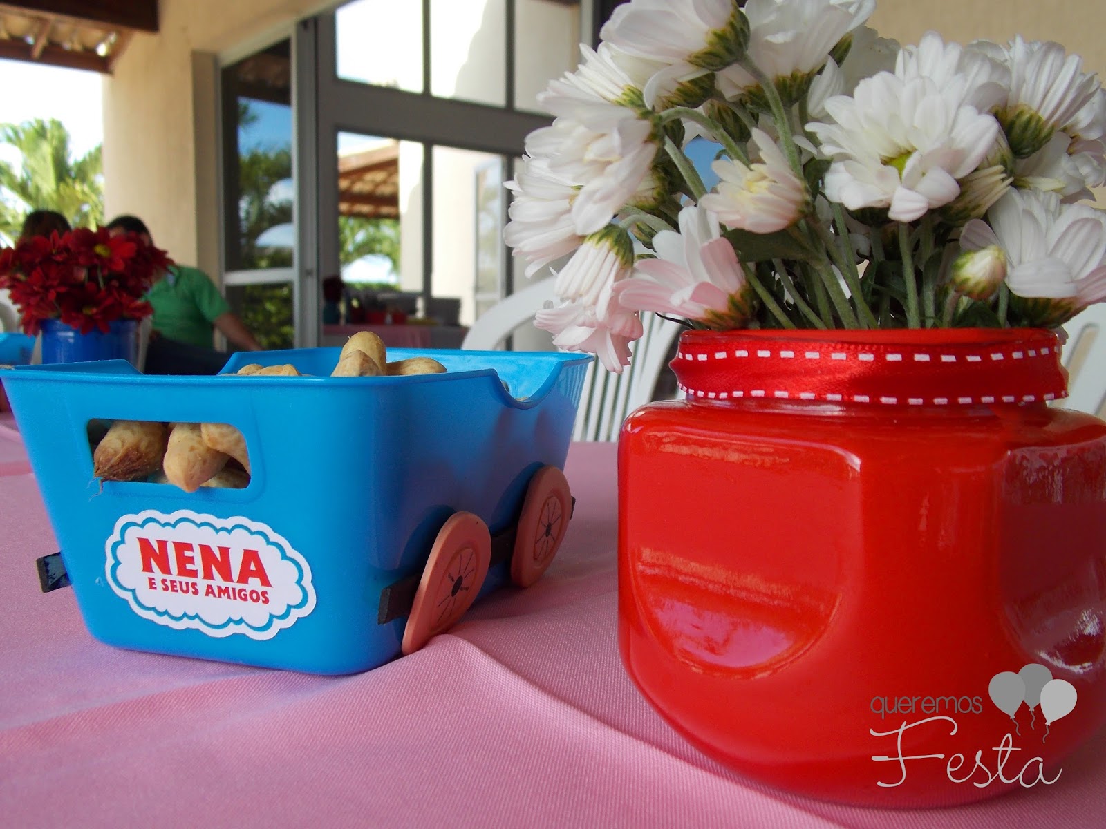 Nas mesas, potinhos pintados com tinta acrílica com mini margaridas e vagões de trens com amendoim para beliscar.